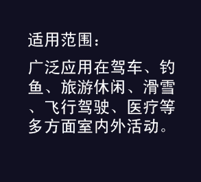 被廣泛應(yīng)用在駕車(chē)、釣魚(yú)、旅游休閑、滑雪、飛行駕駛、醫(yī)療等多方面。